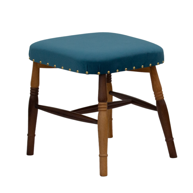 クラシカルな脚と深いブルーの座面が特徴的な、木製のスツールです。 ワークスペースのサブチェアや、寝室のアクセントとして使用できます。 [before] デッドストックの椅子パーツと布地を組み合わせています。 [after] 脚部と座面の色味を合わせて調整し、一体感のある落ち着いた表情に仕上げました。 ブルーの張地が引き立つよう鋲の色味を整え、上品な印象にしています。 [size] W460×D450×H465㎜ [製品表示] 構造部材:オーク材(無垢) 表面加工:ウレタン樹脂塗装 張り材:布(組成不明) クッション材:ウレタンフォーム 取り扱い上の注意: 本製品は中古素材や廃材を使用したリメイク家具です。 素材の特性上、色・質感・形状に個体差があります。 小さな傷、凹み、色ムラ、接合跡などが見られる場合がありますが、素材の特性によるものです。 ご使用上の安全性には問題ありませんが、予めご了承ください。 組み立てた状態でのお届けとなります。サイズをご確認ください。 ・直射日光や高温多湿の場所を避けて設置してください。 ・座った状態で椅子を傾けないでください。 ・水や油をこぼした場合は、すぐに拭き取ってください。 ・椅子の上に乗って踏み台代わりに使用したり、上に乗って飛び跳ねたりしないでください。