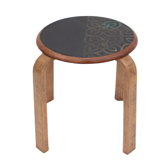 天板のパターンが特徴的な木製のスツールです。 和洋問わず空間に馴染むアクセントチェアとして活用できます。 [before] シンプルで素朴なデザインの木製のスツールでした。 [after] 座面に施したゴールドのパターンは、 歴史あるホテルで使用されていたテーブルパーツの一部から、版として引用しました。 脚部には落ち着いたグリーンを加え、空間に馴染む柔らかさを添えています。 [size] 390×390×440 mm [製品表示] 構造部材:天然木 表面加工:ウレタン塗装、水性ステイン塗装 取り扱い上の注意: 本製品は中古素材や廃材を使用したリメイク家具です。 素材の特性上、色・質感・形状に個体差があります。 小さな傷、凹み、色ムラ、接合跡などが見られる場合がありますが、素材の特性によるものです。 ご使用上の安全性には問題ありませんが、予めご了承ください。 組み立てた状態でのお届けとなります。サイズをご確認ください。 ・直射日光や高温多湿の場所を避けて設置してください。 ・水や油をこぼした場合は、すぐに拭き取ってください。 ・椅子の上に乗って踏み台代わりに使用したり、飛び跳ねたりしないでください。 ・座った状態で椅子を傾けないでください。
