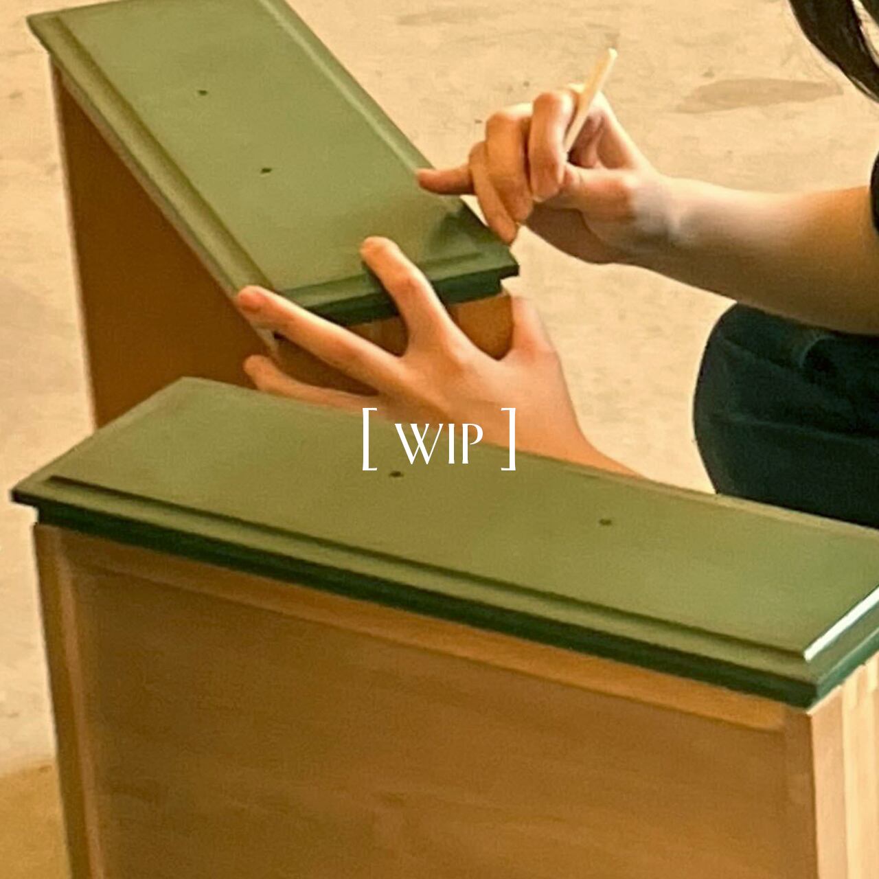 引き出しは元の取っ手を活かし、上下の扉は白い取っ手に付け替えました。ディティールの魅力を引き立てるためにヴィンテージ風に再塗装し、曇りが出ていた表情を整え仕上げています。