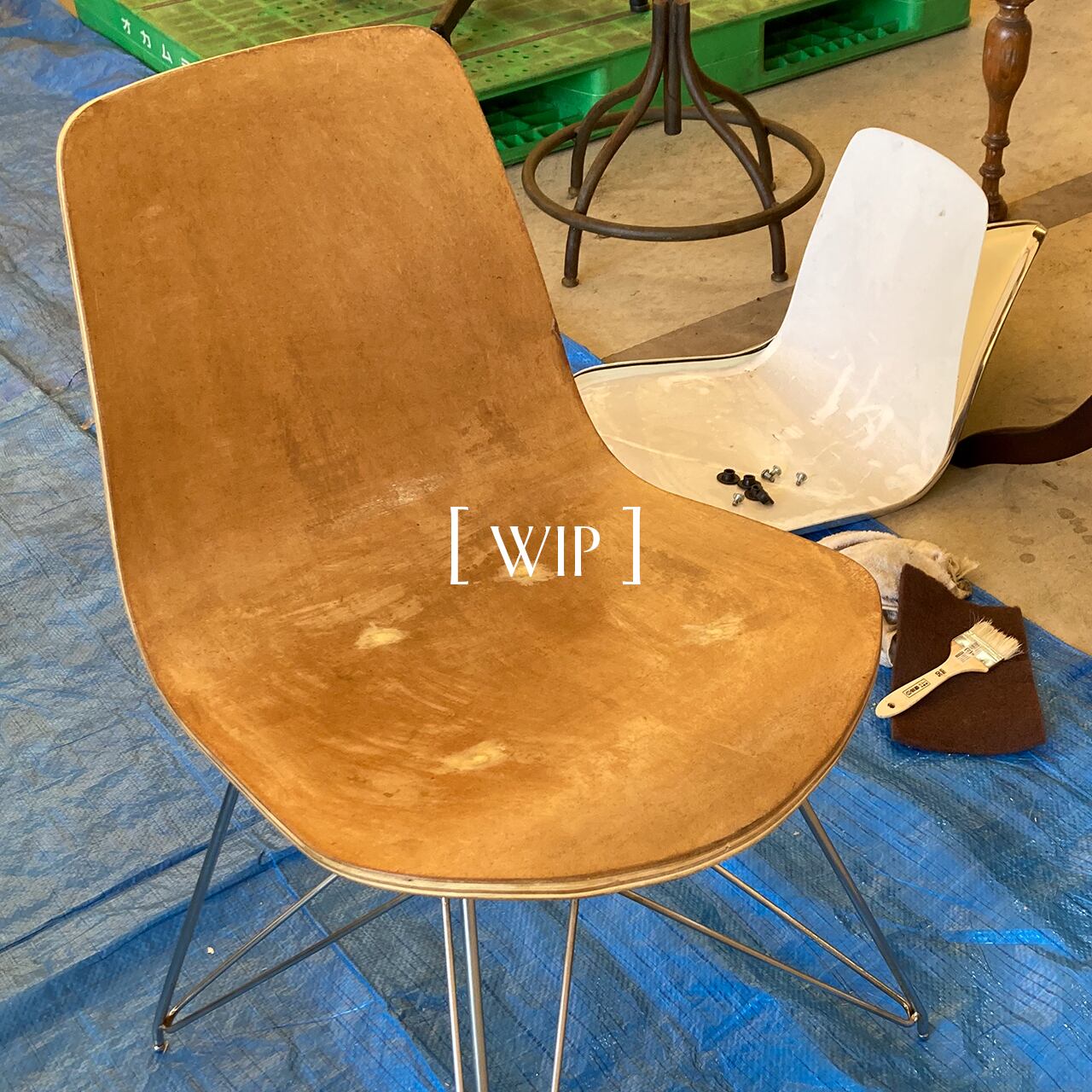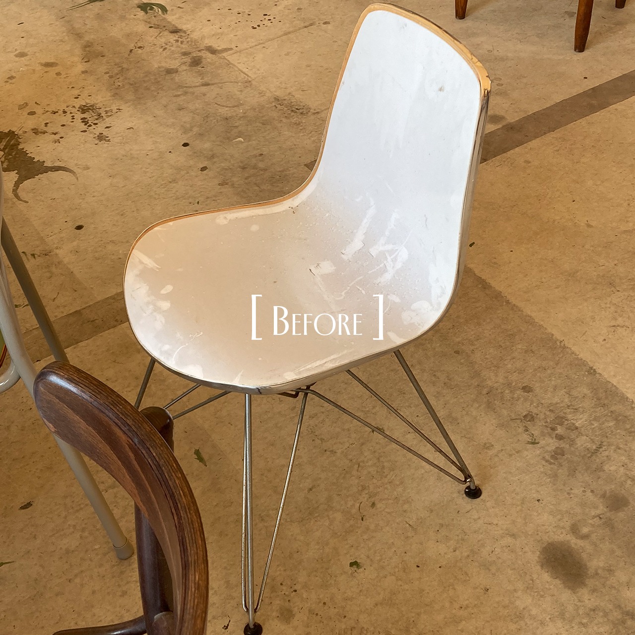 表面の素材が剥がれ、傷や鉄部分のさびが目立つ状態の椅子でした。