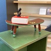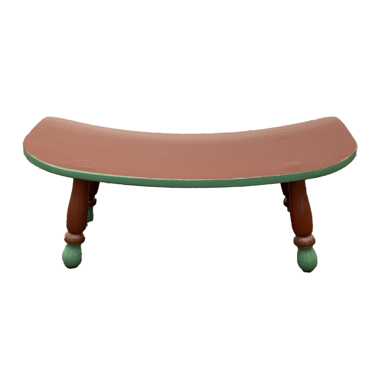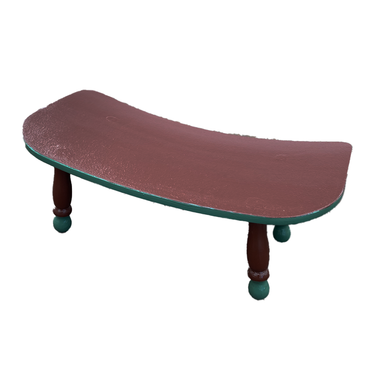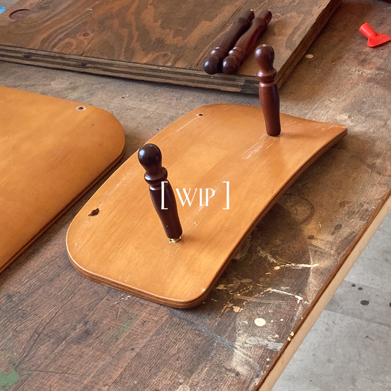 学校椅子の背もたれを活かした曲線が特徴の小さな木製家具です。