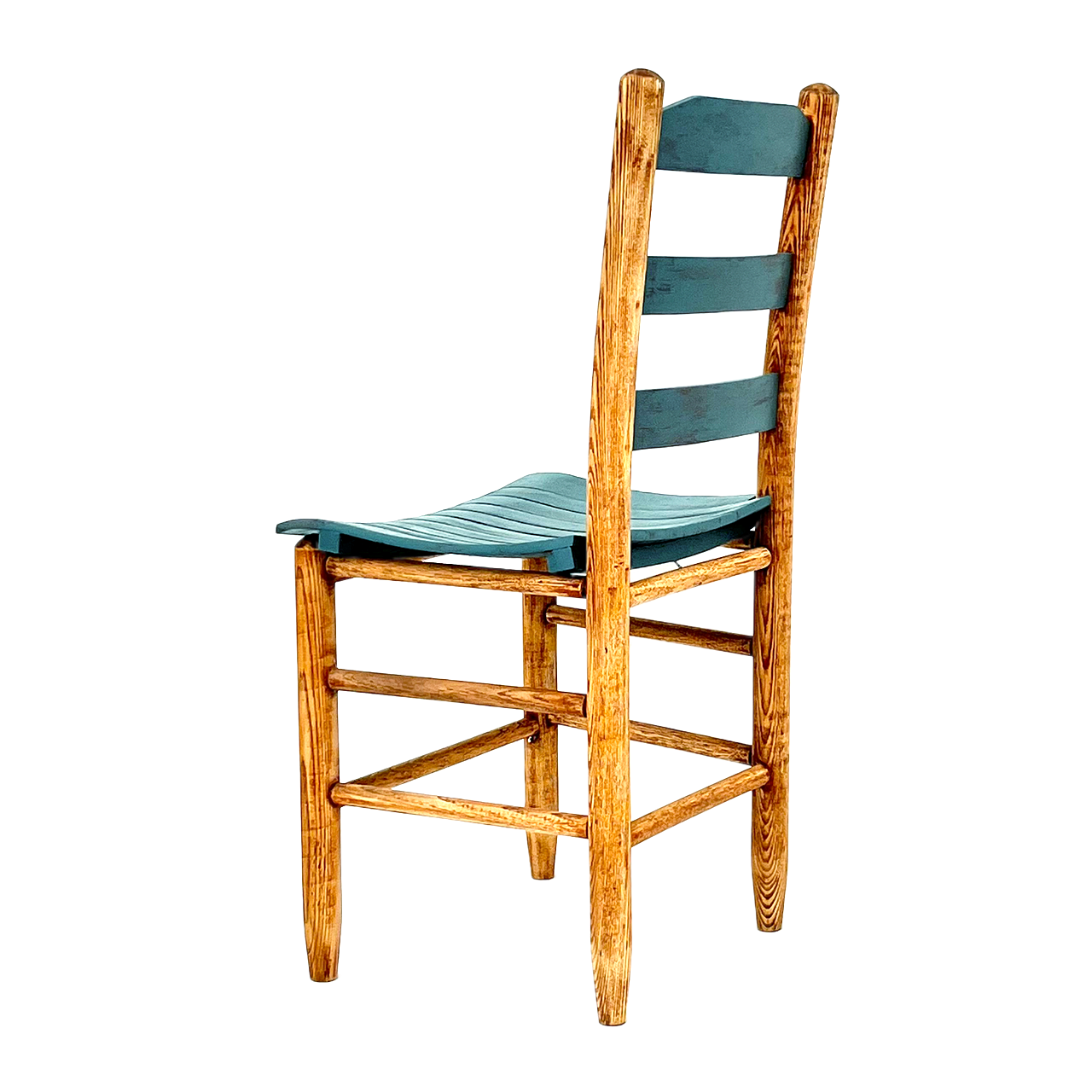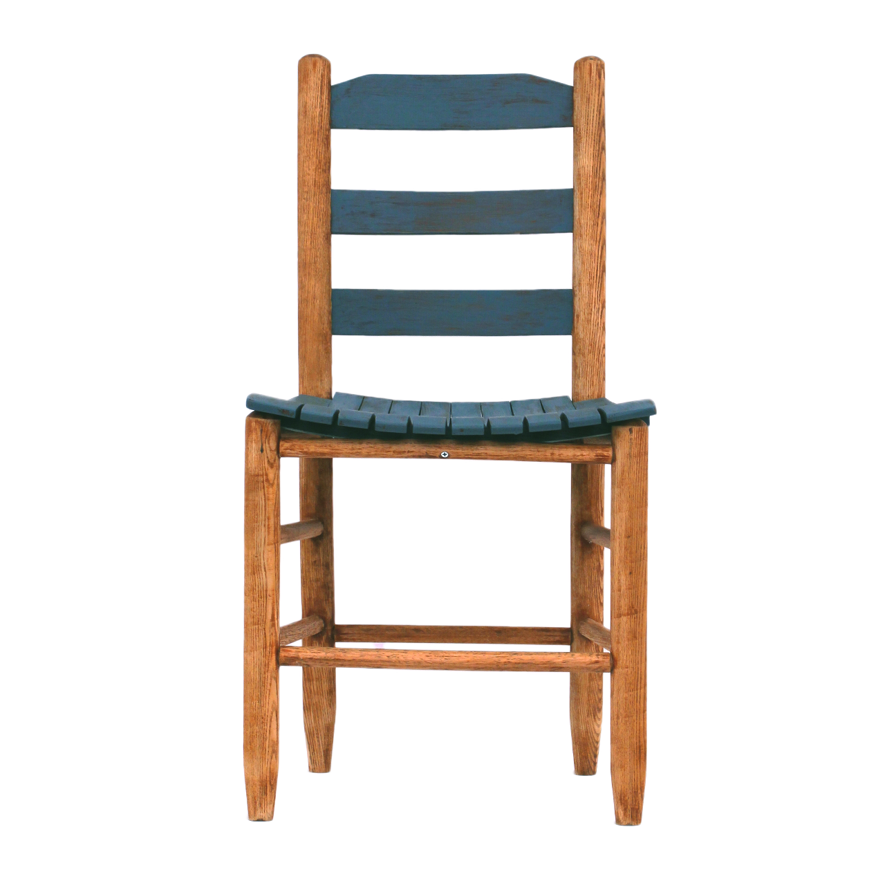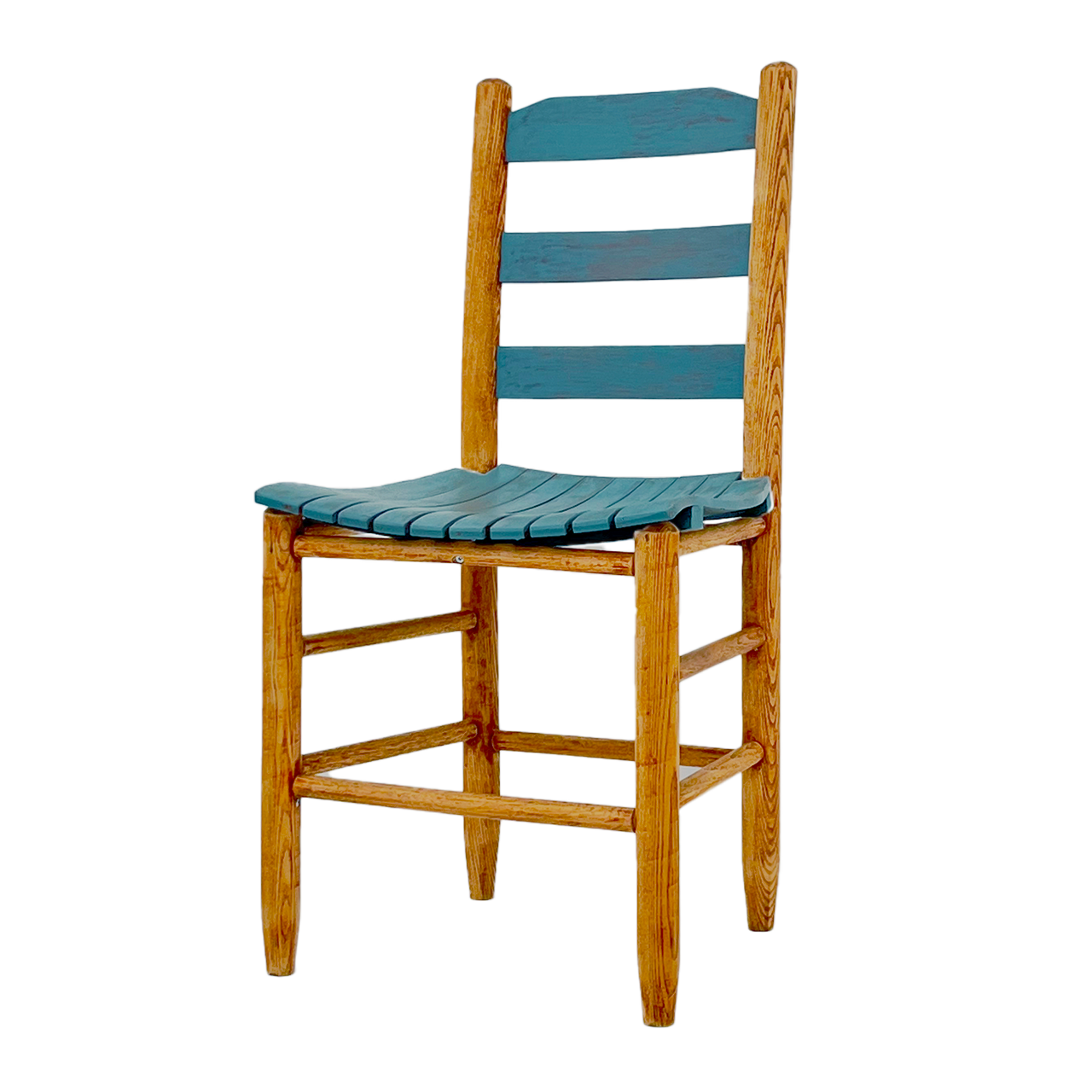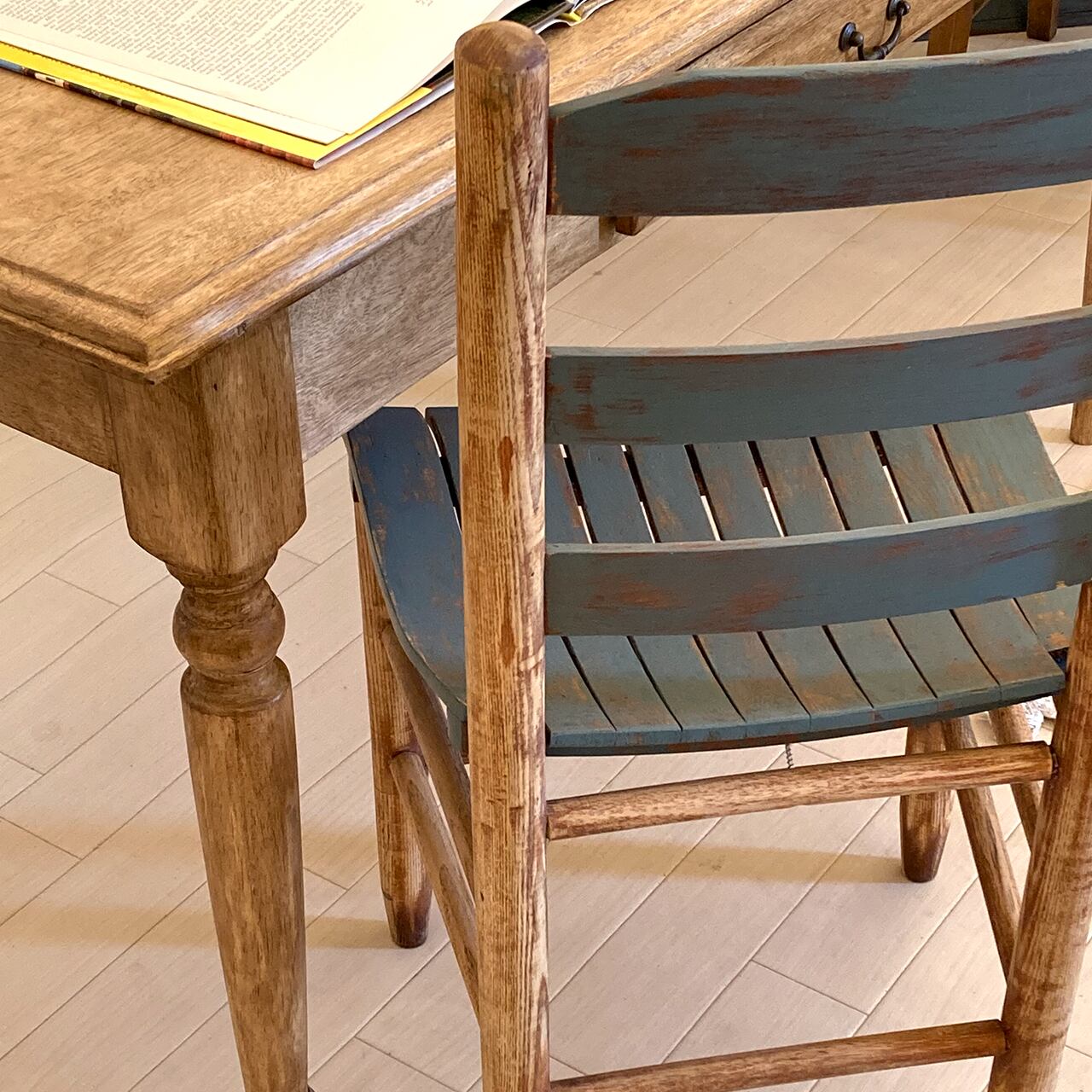 ブルーのかすれ塗装が特徴的な、木製の椅子です。