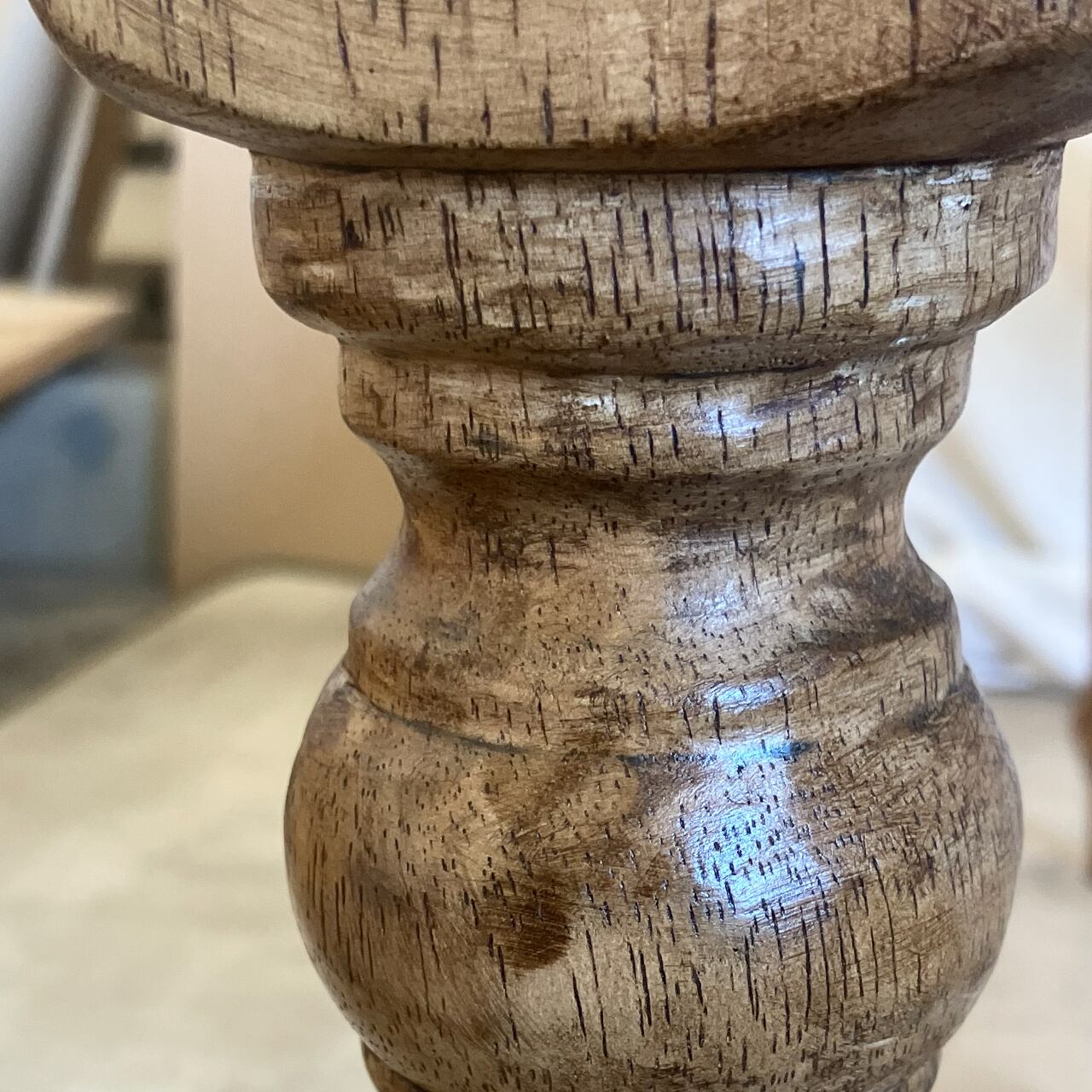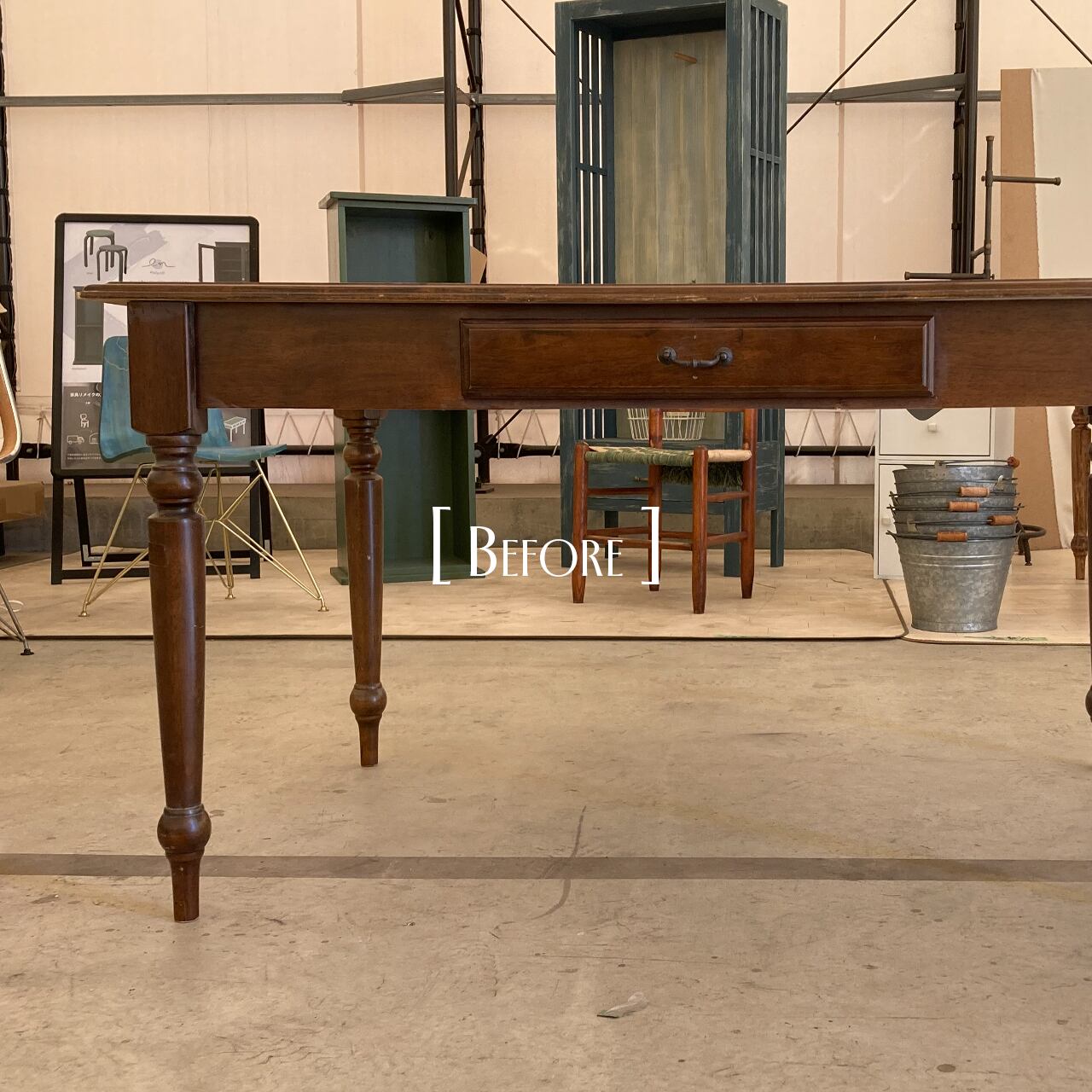 歴史あるホテルで使用されていたため傷が多くあり、重厚な印象のダイニングテーブルでした。
