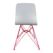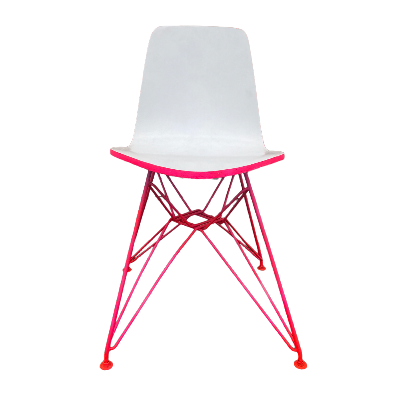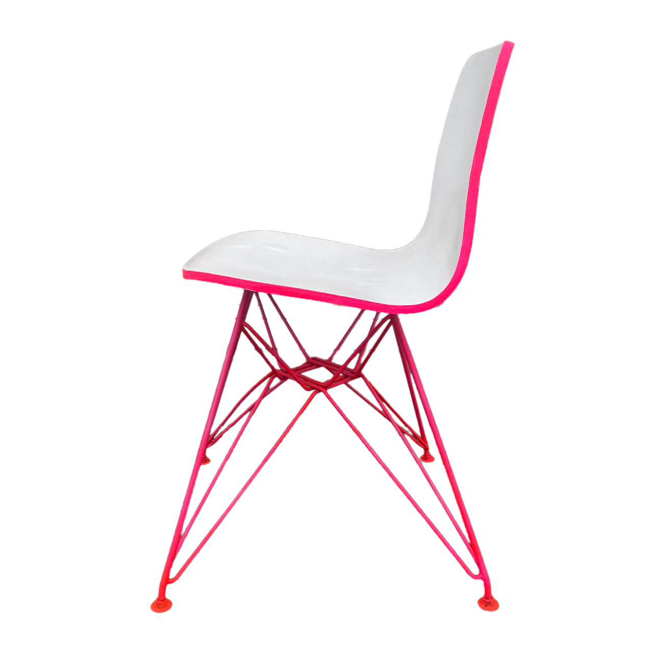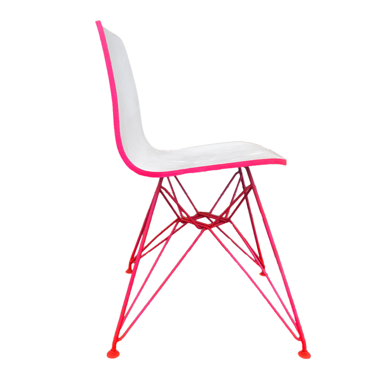 TVドラマの世界感に合わせて生まれた特別な一脚で、白いボディと蛍光ピンクのラインが特徴のチェアです。