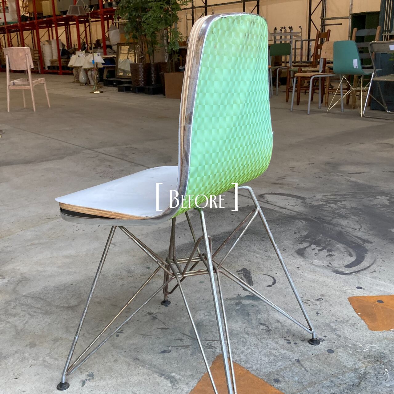 表面の素材が剥がれ、傷や鉄部分のさびが目立つ状態の椅子でした。