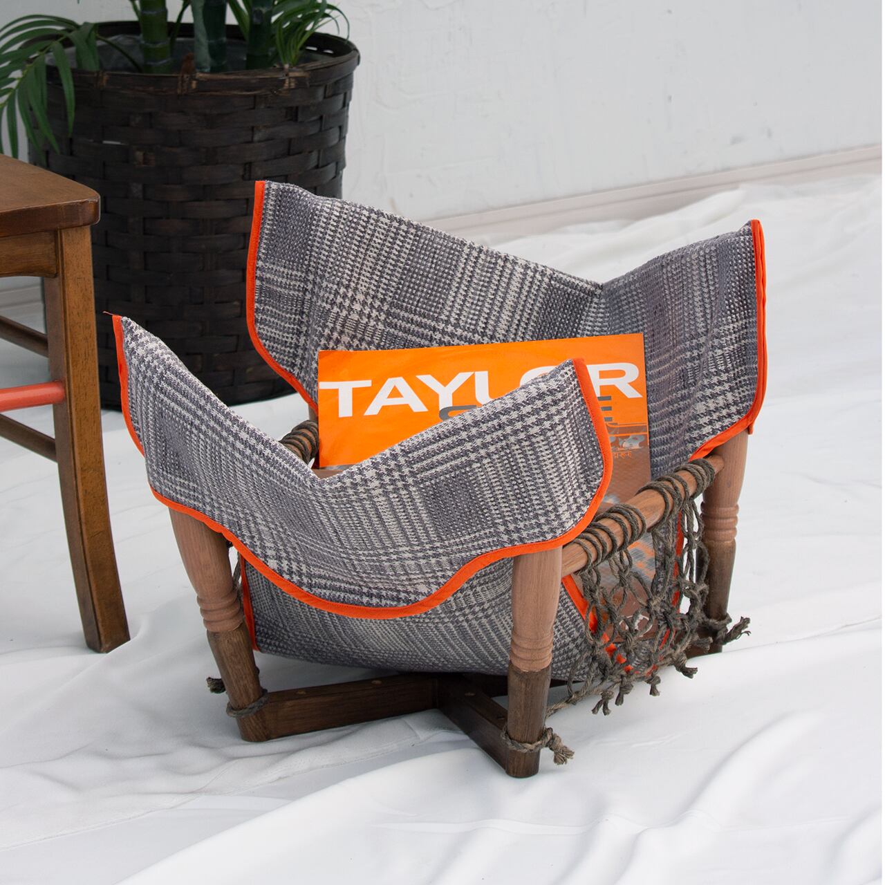 鮮やかなオレンジ色のラインとチェック柄の組み合わせが特徴のバスケットです。