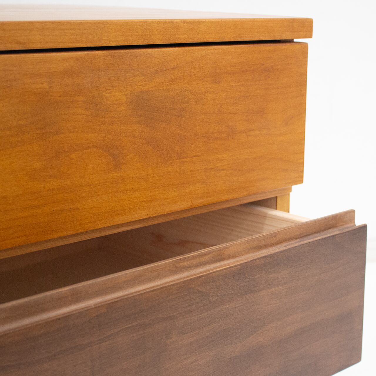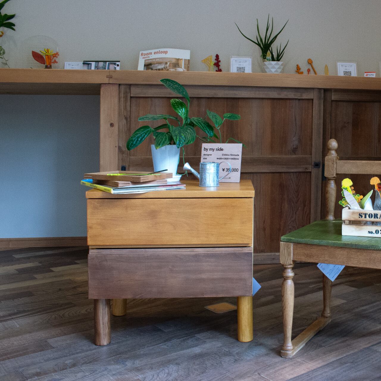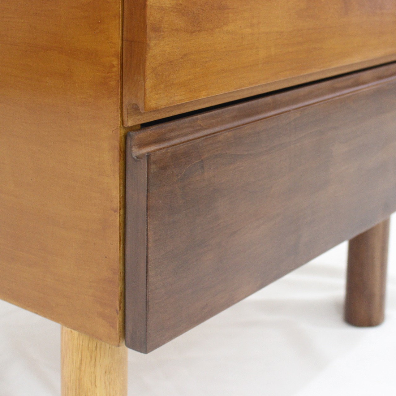2色の引き出しの色味と高さのある脚が特徴的な、木製の小型棚です。