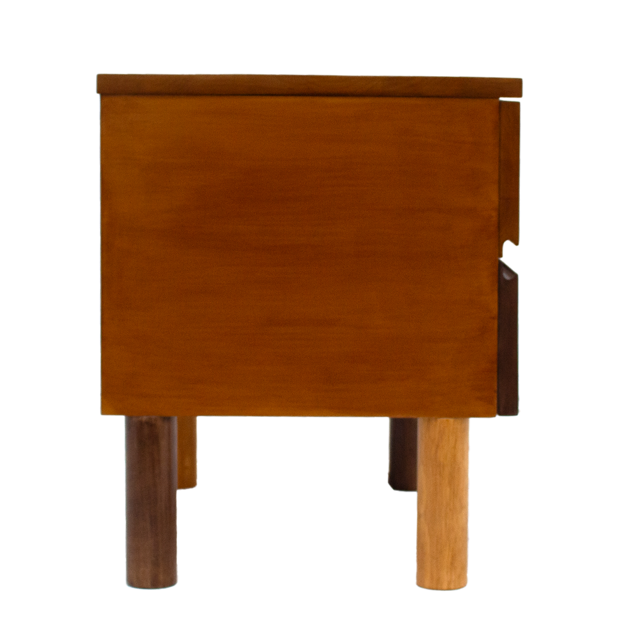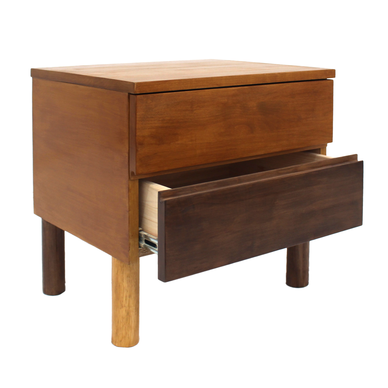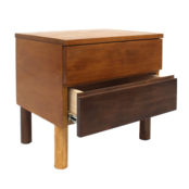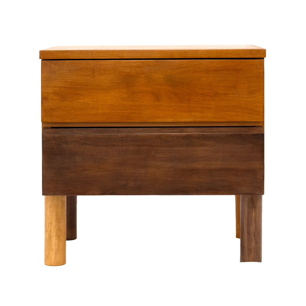 2色の引き出しの色味と高さのある脚が特徴的な、木製の小型棚です。