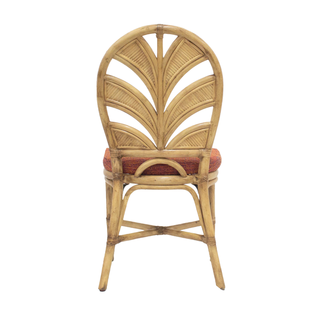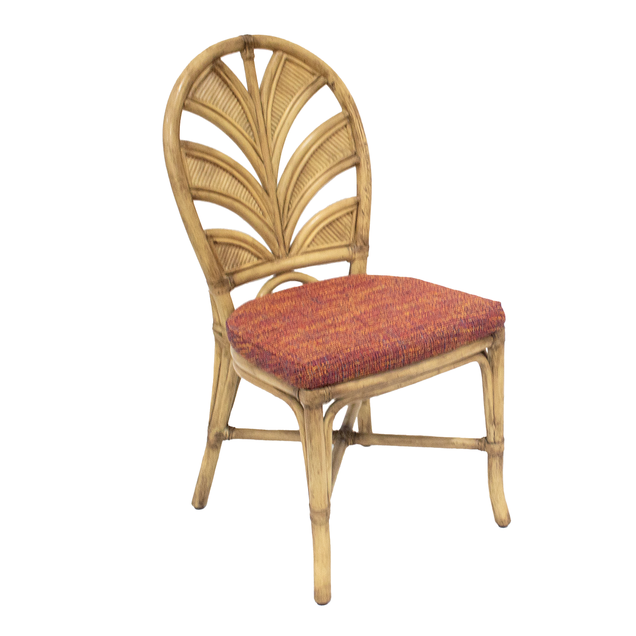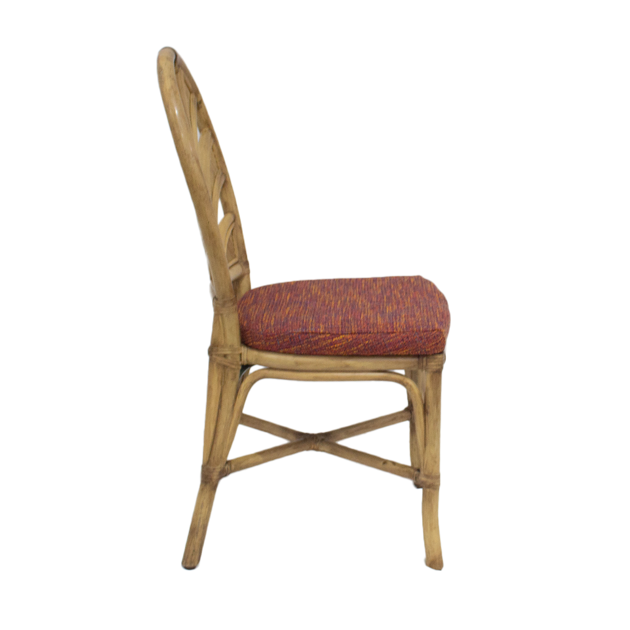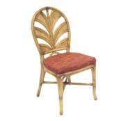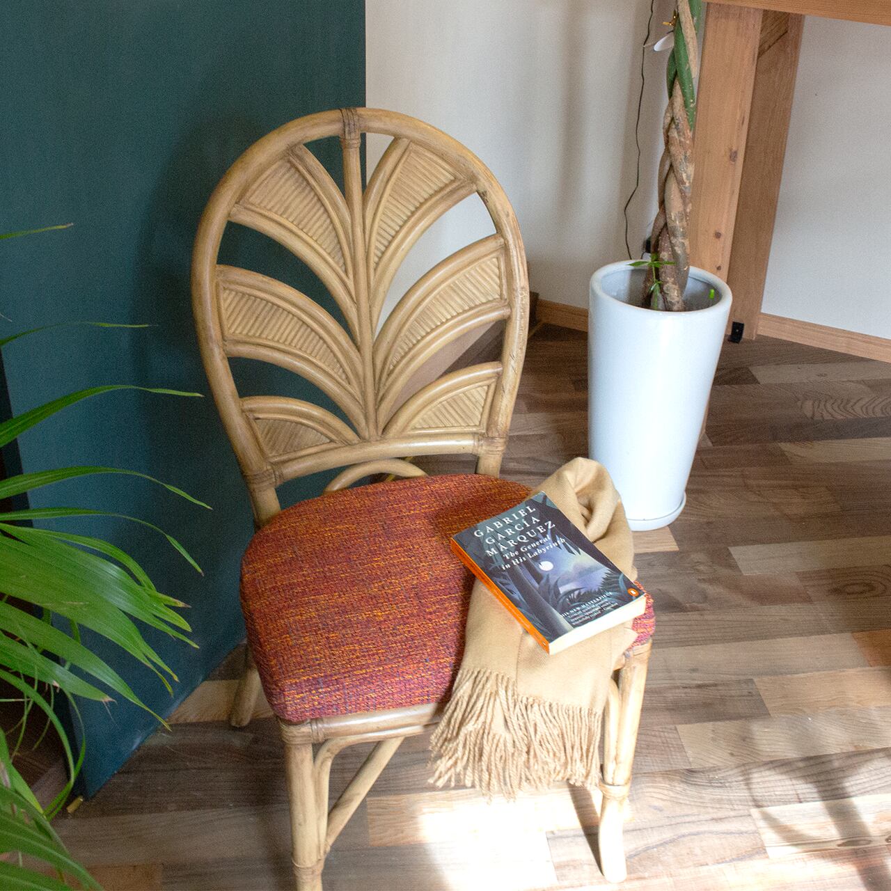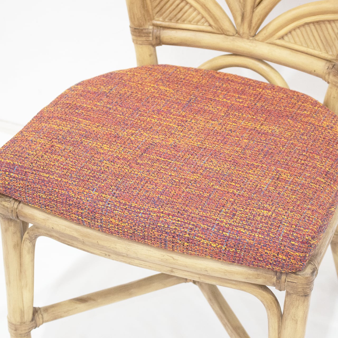 鮮やかな赤いファブリックと、ラタン製の椅子です。