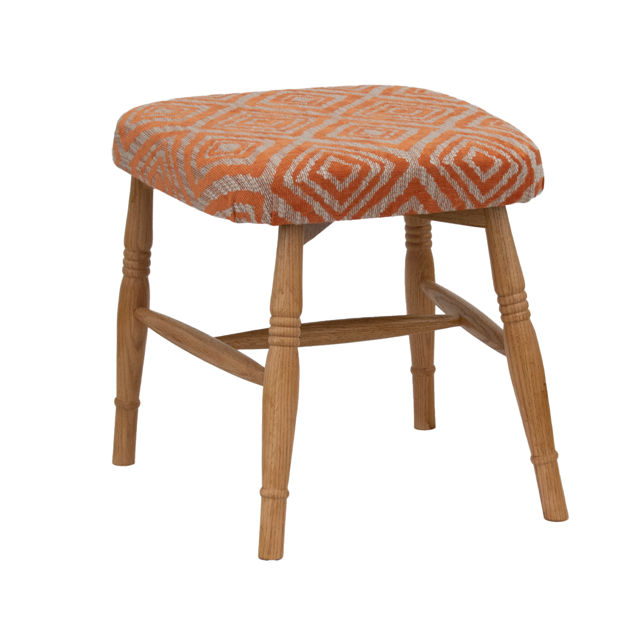 鮮やかなオレンジの幾何学模様が特徴的な、木製のスツールです。