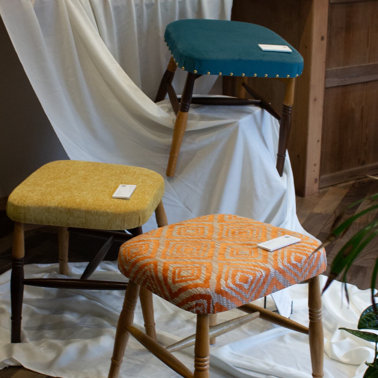 デッドストックの椅子パーツと布地を組み合わせています。