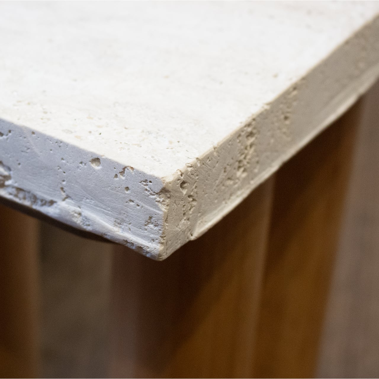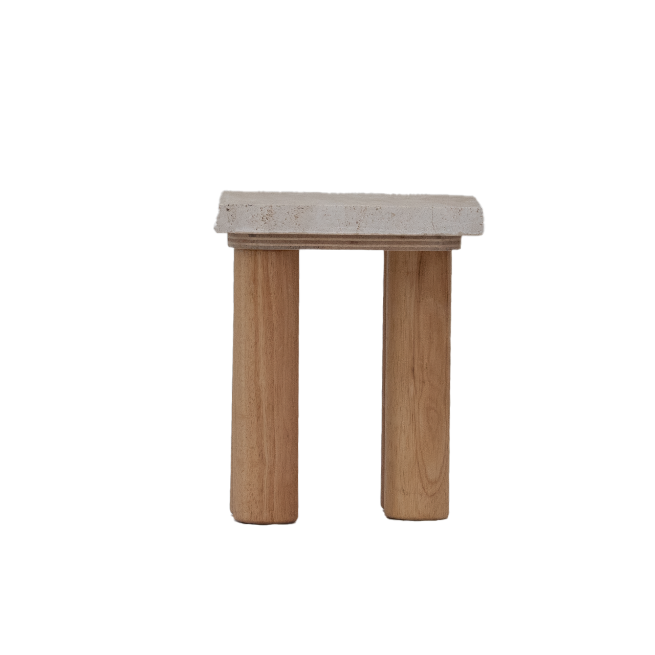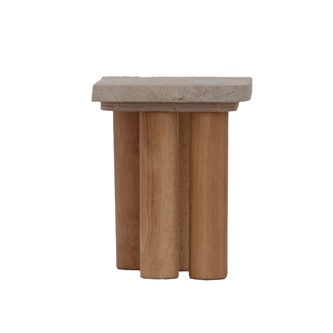 天然石の質感と滑らかな木製脚が特徴的な、小型の木製テーブルです。
