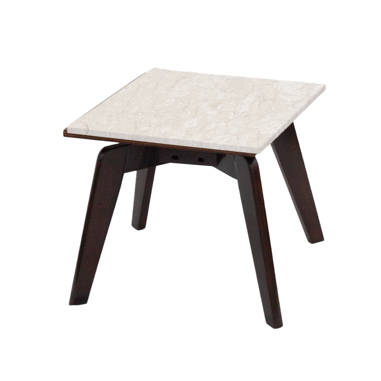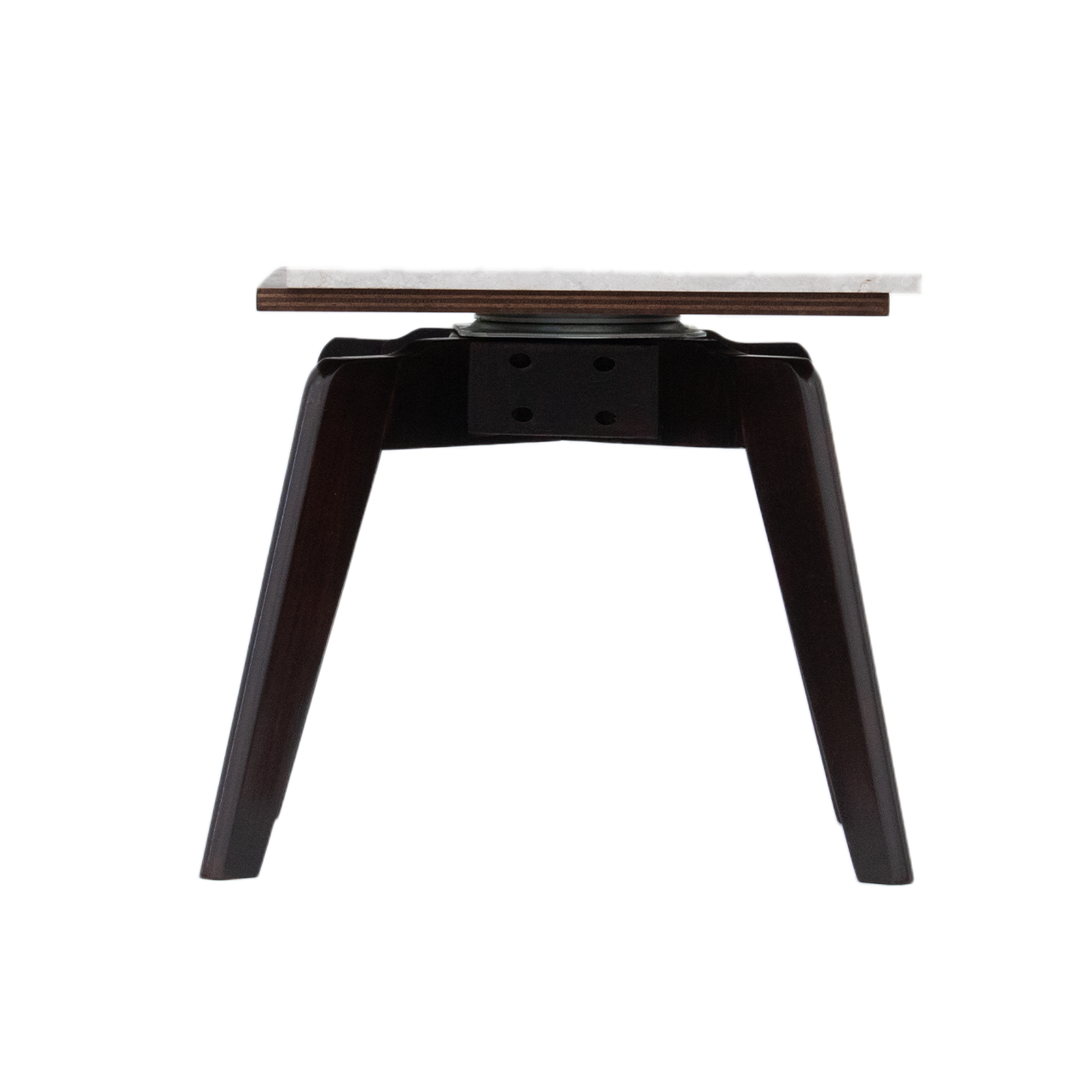 回転椅子の脚と大理石を組み合わせた、小型の木製テーブルです。