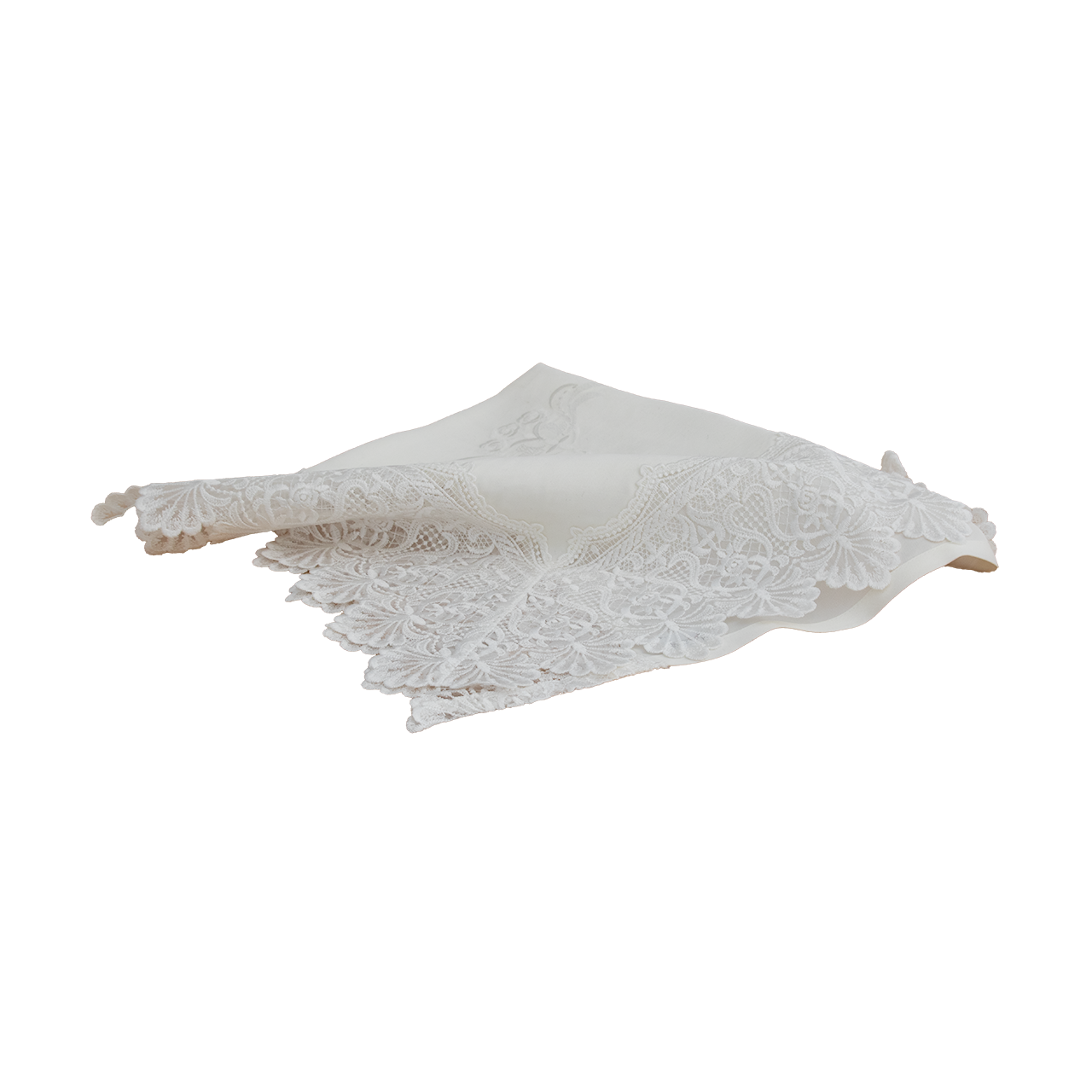 3隅に幅の広い豪華なレースがあしらわれた布。布部分にはバラの花束のようなエンブレムが刺繍されています。
